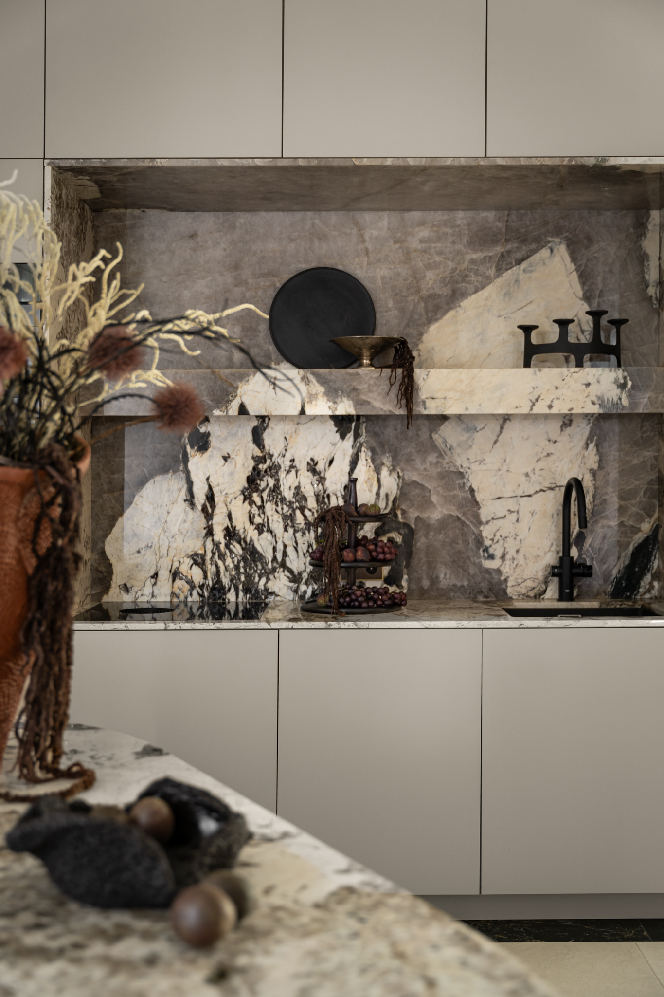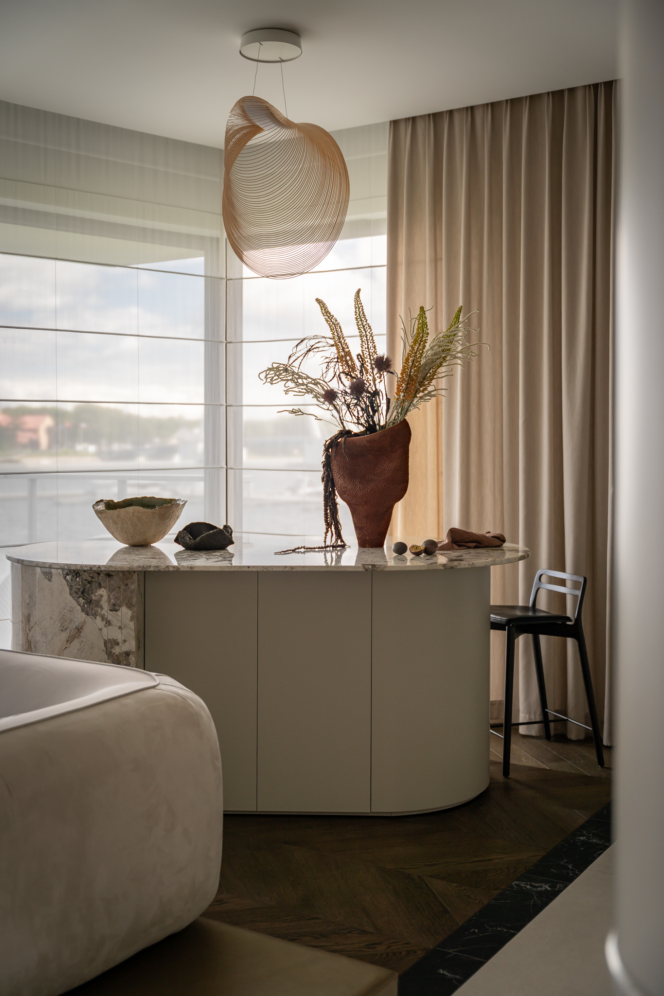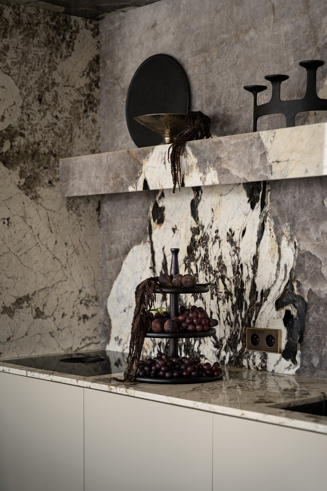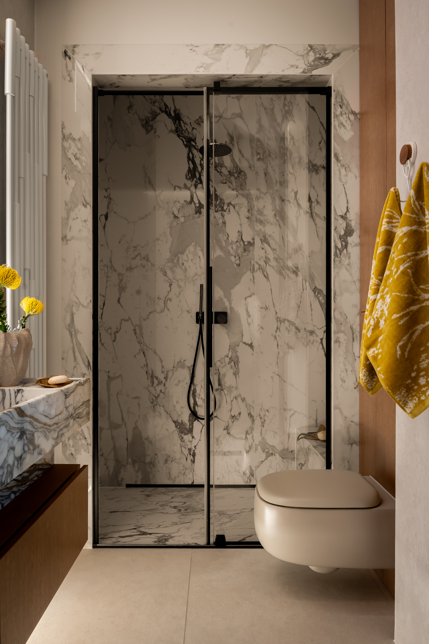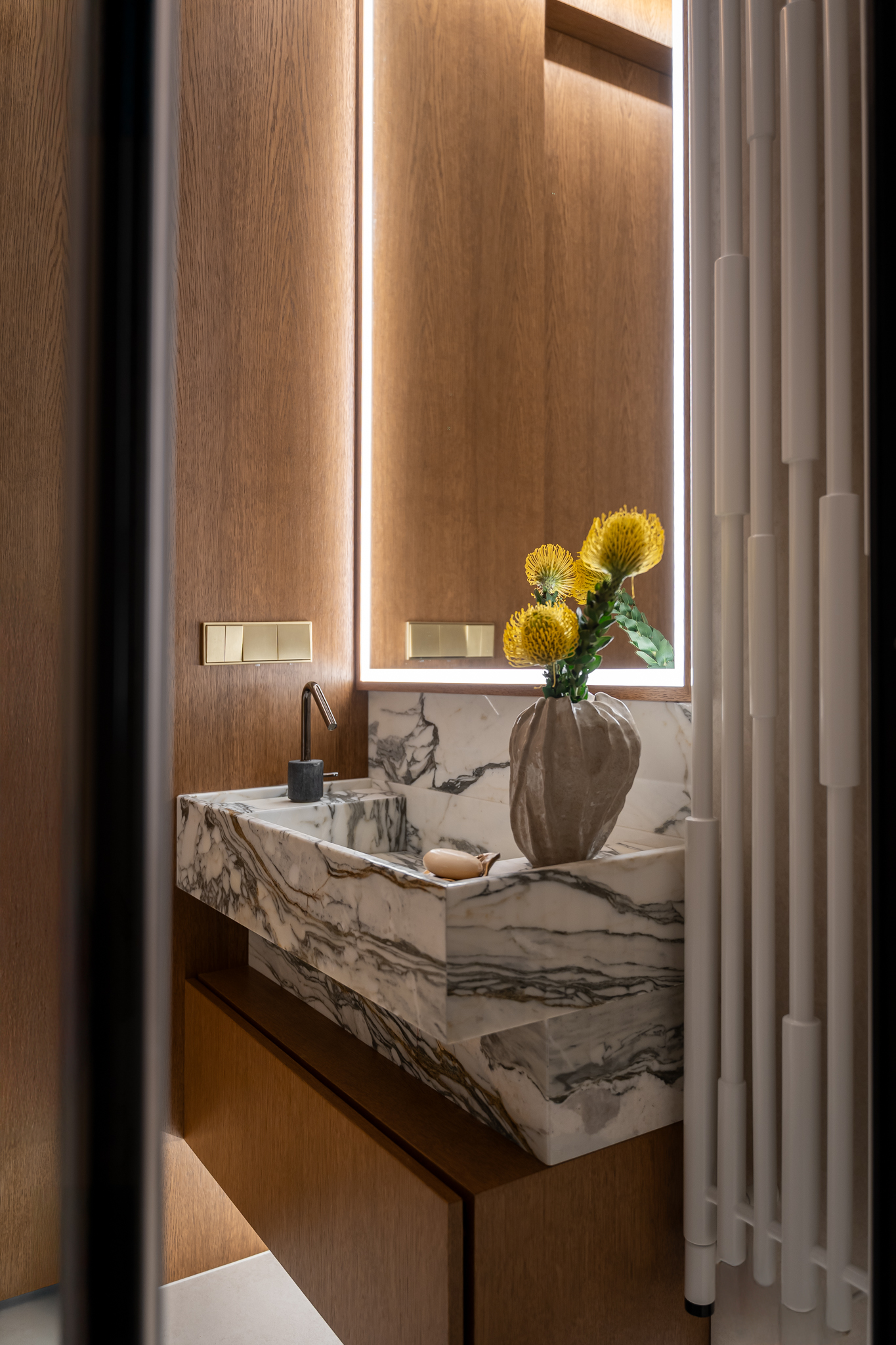 Już od progu czuć, że to wnętrze powstało z myślą o latach, a nie chwilowej modzie. Postawiliśmy na spójność i ponadczasową elegancję, budując atmosferę na duecie: kamienia i drewna. W kuchni i toalecie króluje dekoracyjny kwarcyt Patagonia, w łazience marmur, a w każdym pomieszczeniu – ciepło drewnianych powierzchni. Czerni i złotu powierzono rolę subtelnych akcentów, które podkreślają luksusowy charakter przestrzeni.