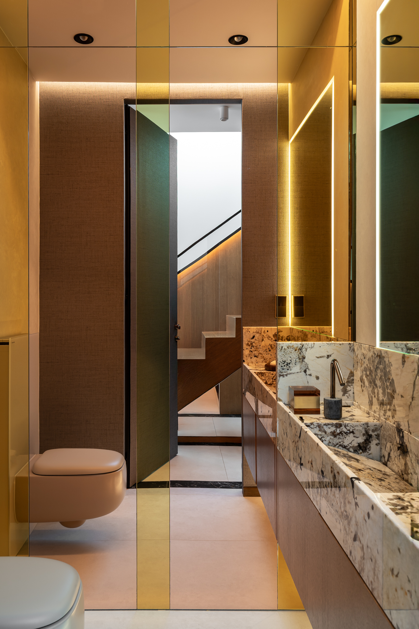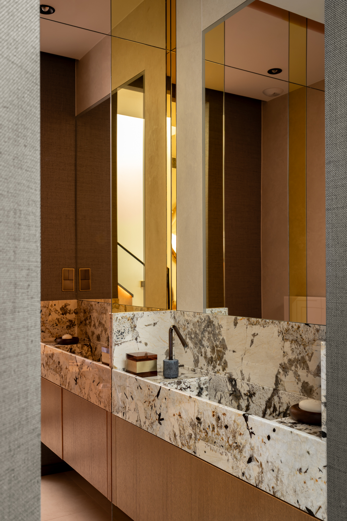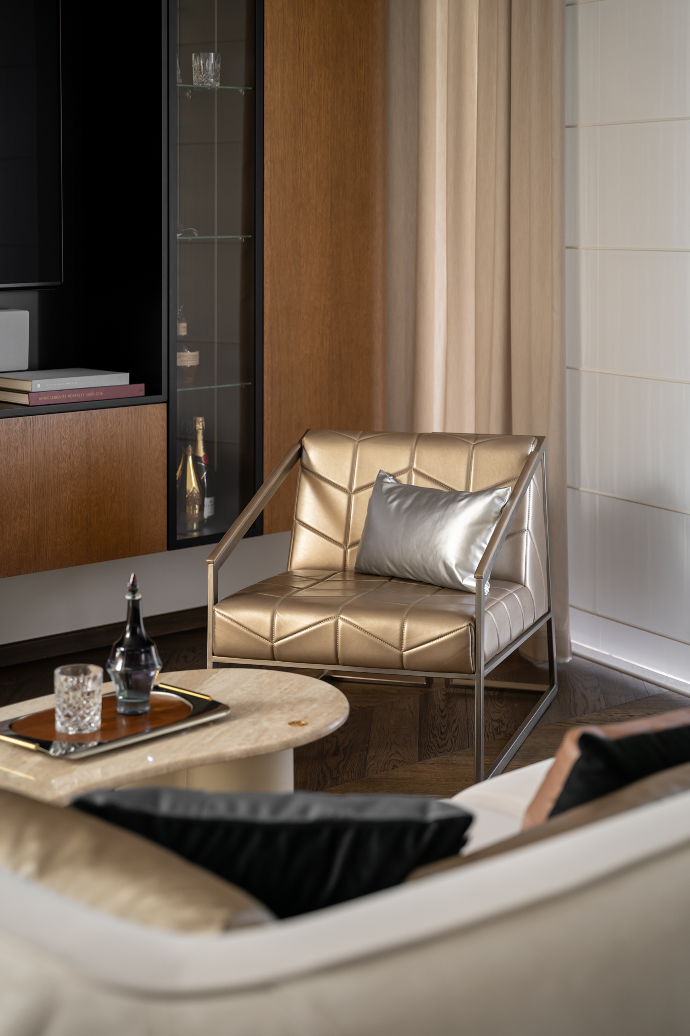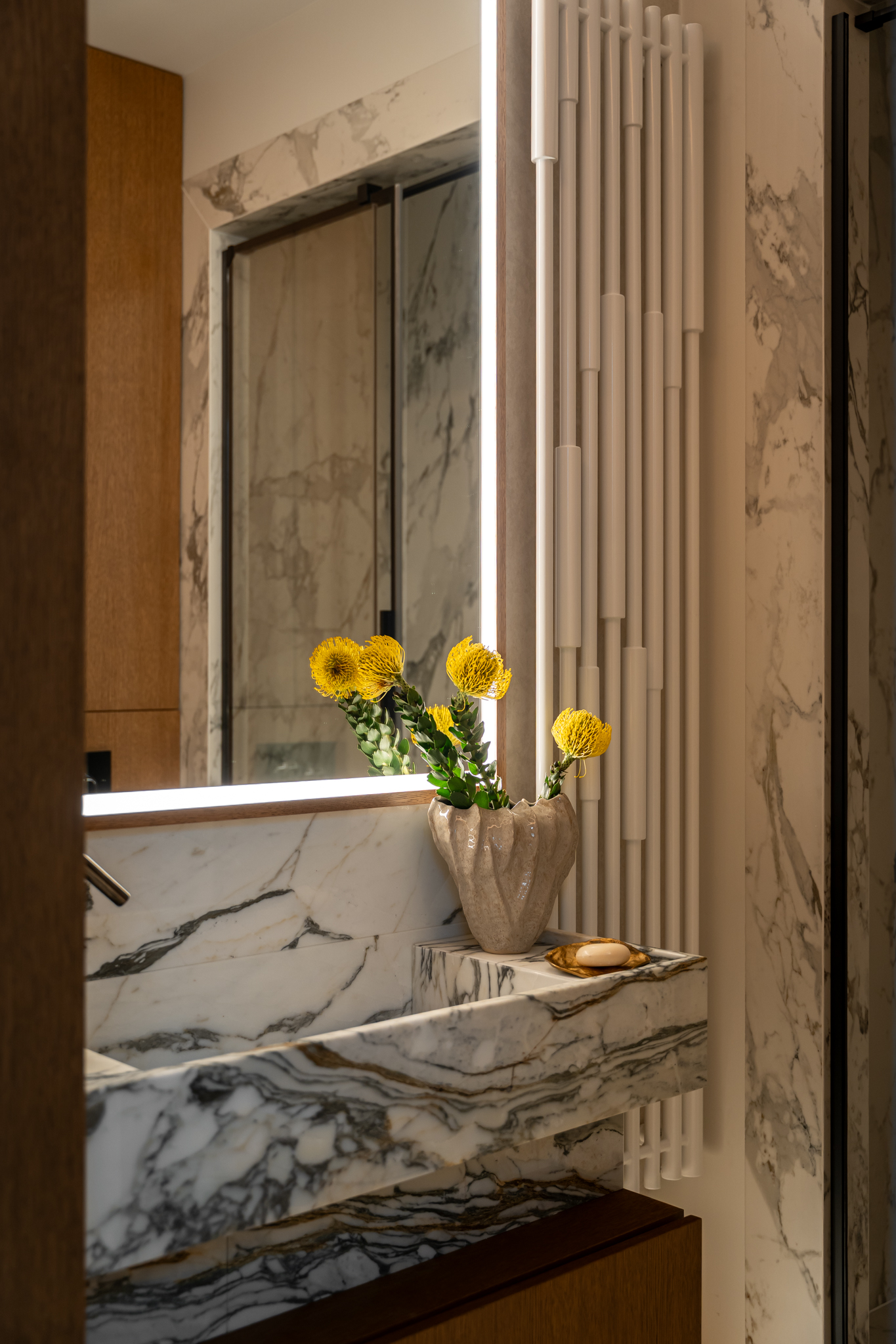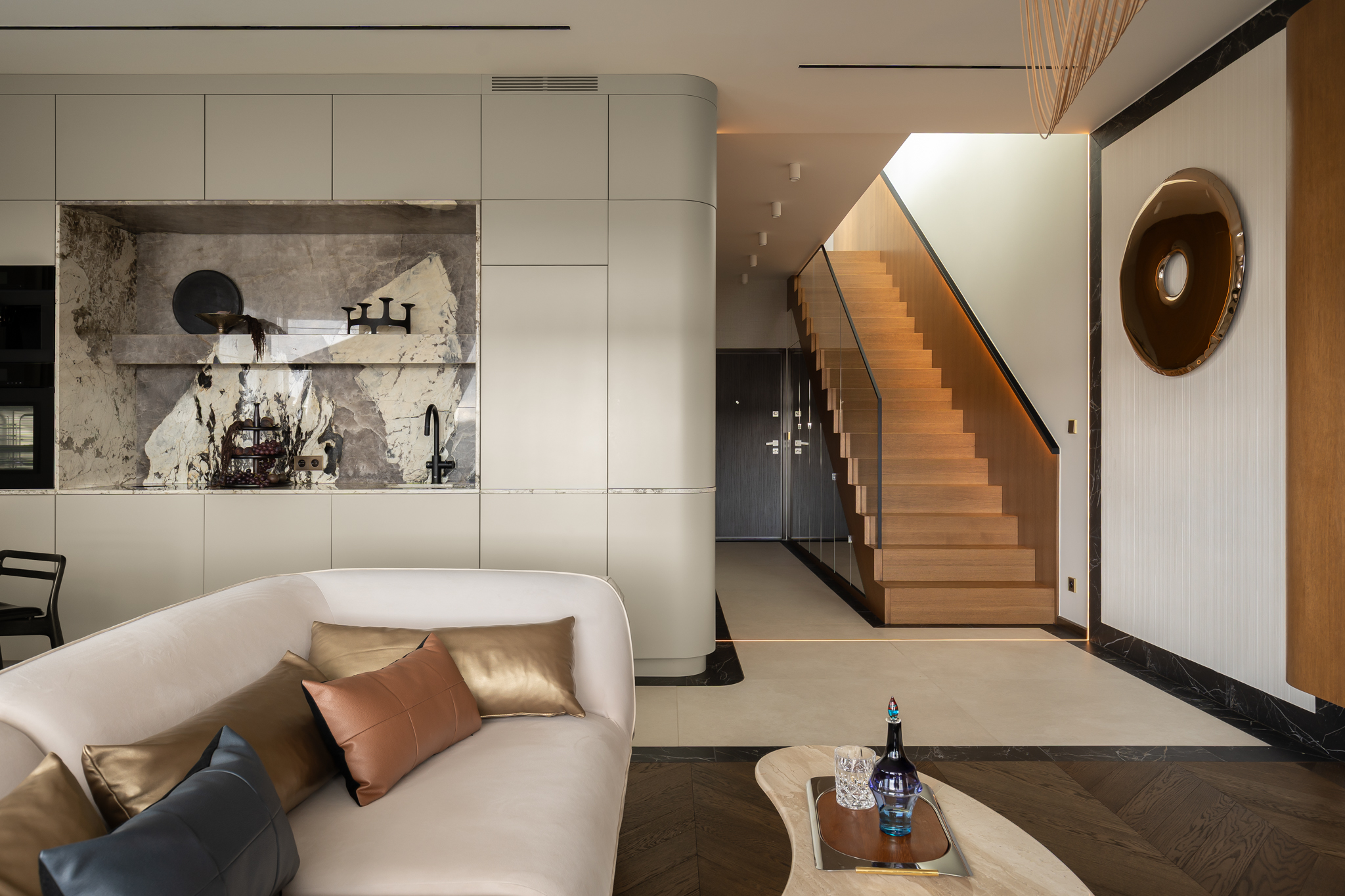 Już od progu czuć, że to wnętrze powstało z myślą o latach, a nie chwilowej modzie. Postawiliśmy na spójność i ponadczasową elegancję, budując atmosferę na duecie: kamienia i drewna. W kuchni i toalecie króluje dekoracyjny kwarcyt Patagonia, w łazience marmur, a w każdym pomieszczeniu – ciepło drewnianych powierzchni. Czerni i złotu powierzono rolę subtelnych akcentów, które podkreślają luksusowy charakter przestrzeni.
