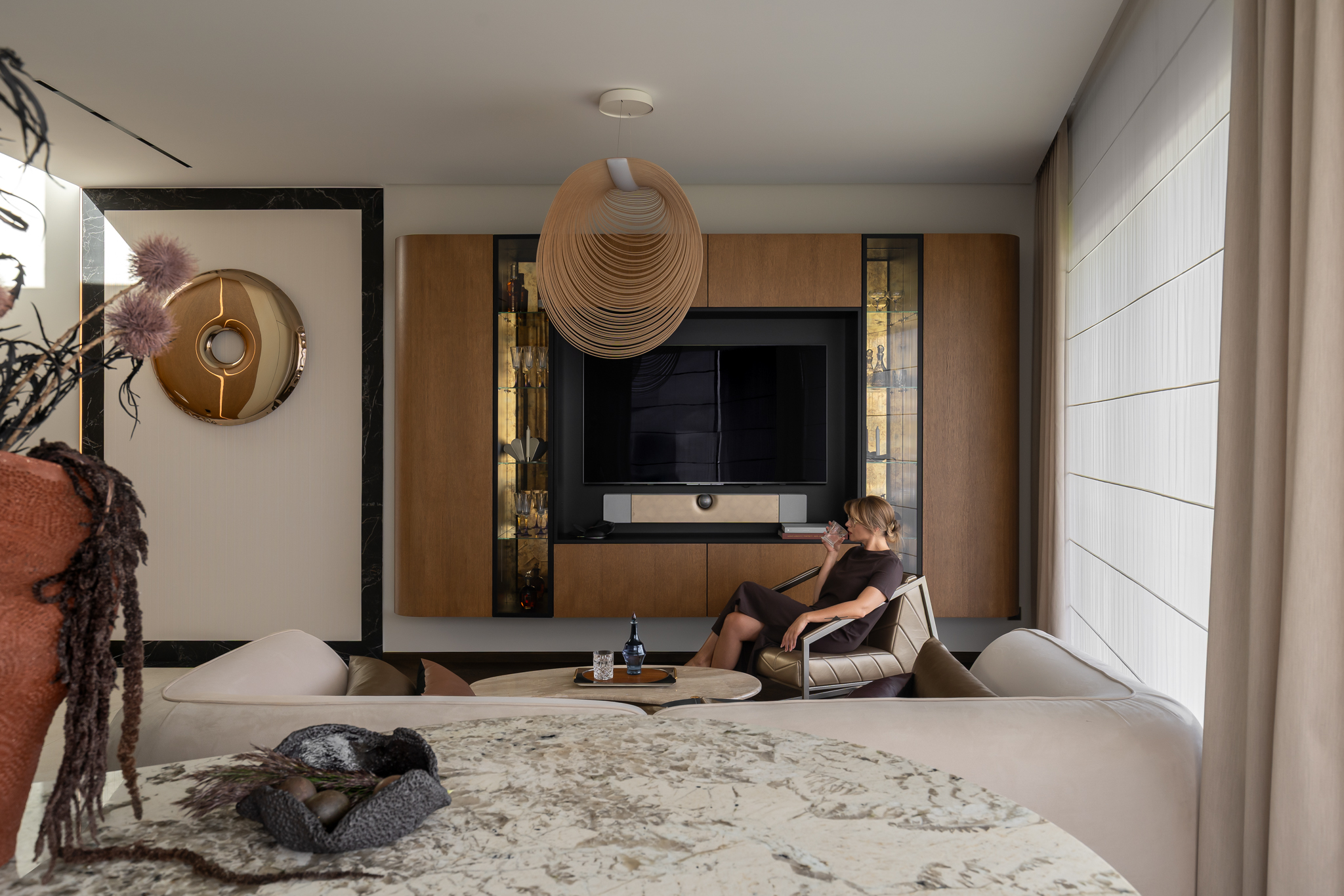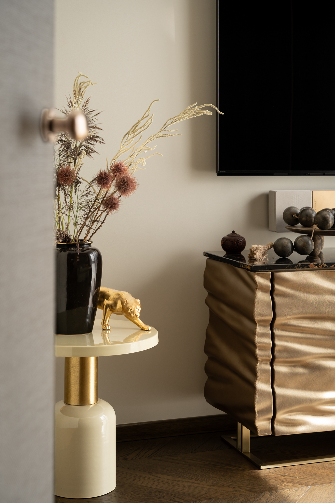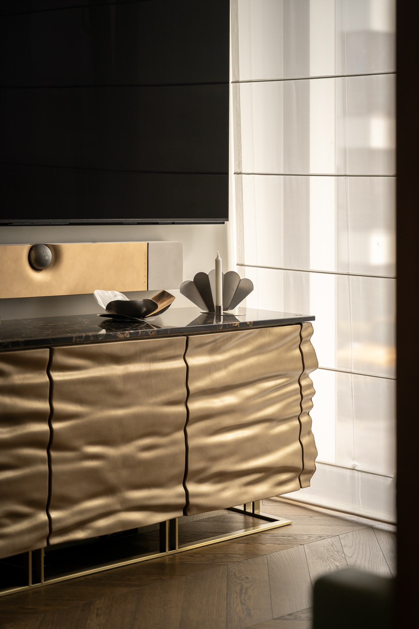 Drugi pokój to gra drewna i zieleni. W centrum uwagi stoi komoda – unikatowy mebel wykonany wg projektu, z barwionej skóry ze szlachetnym marmurowym blatem. Jej pofałdowana forma przypomina rzeźbę, będąc jednocześnie funkcjonalnym elementem wnętrza.