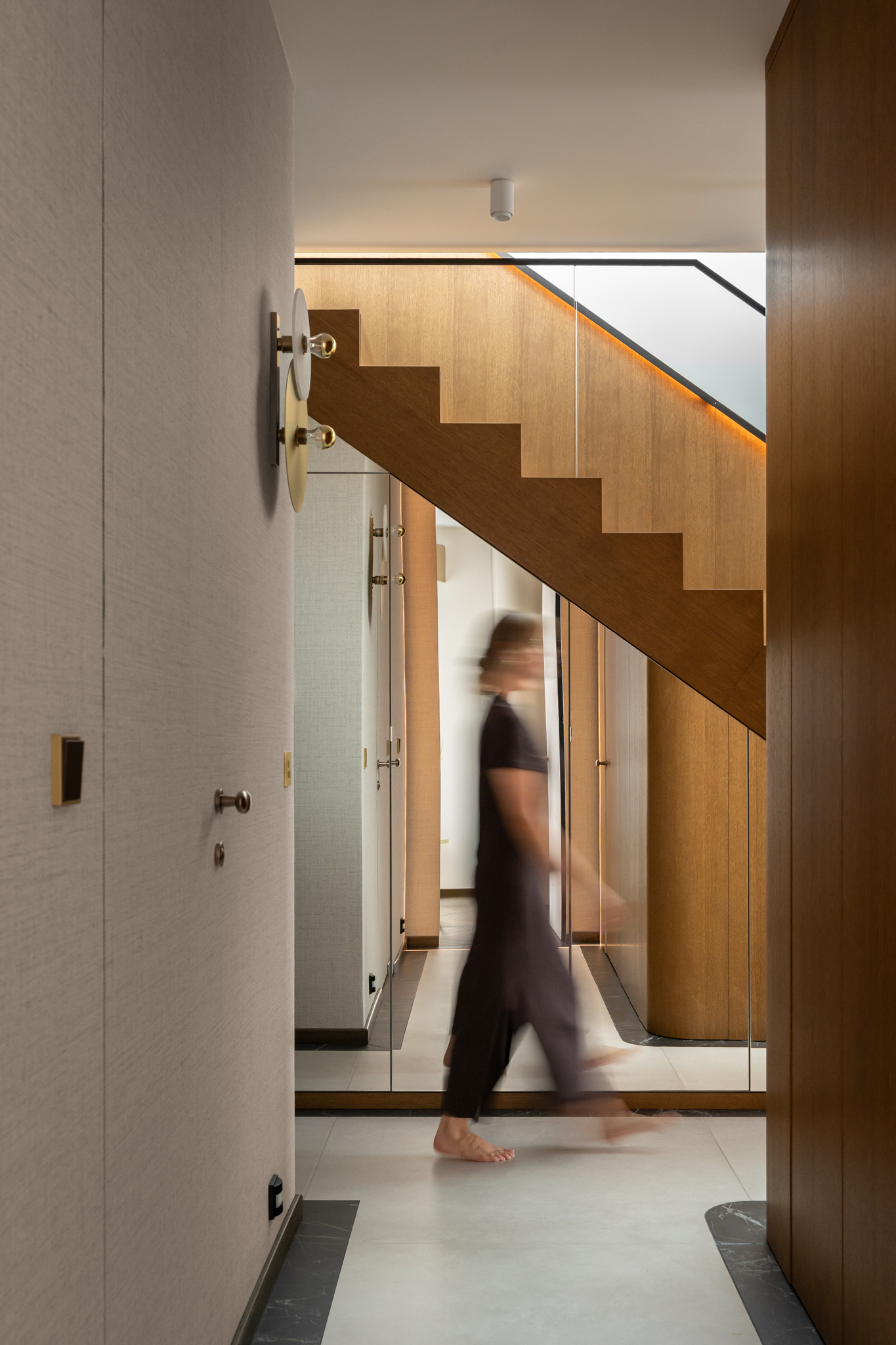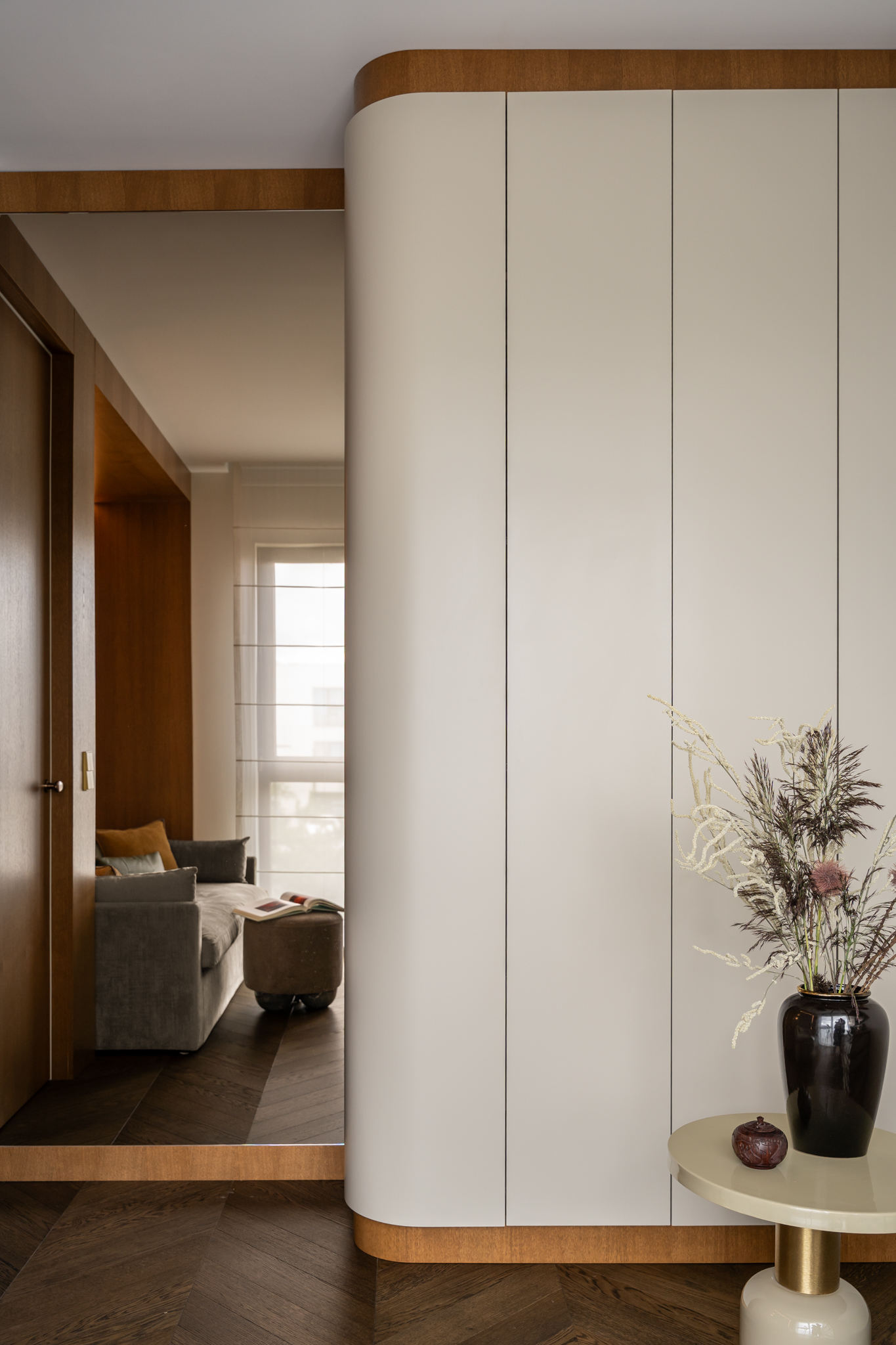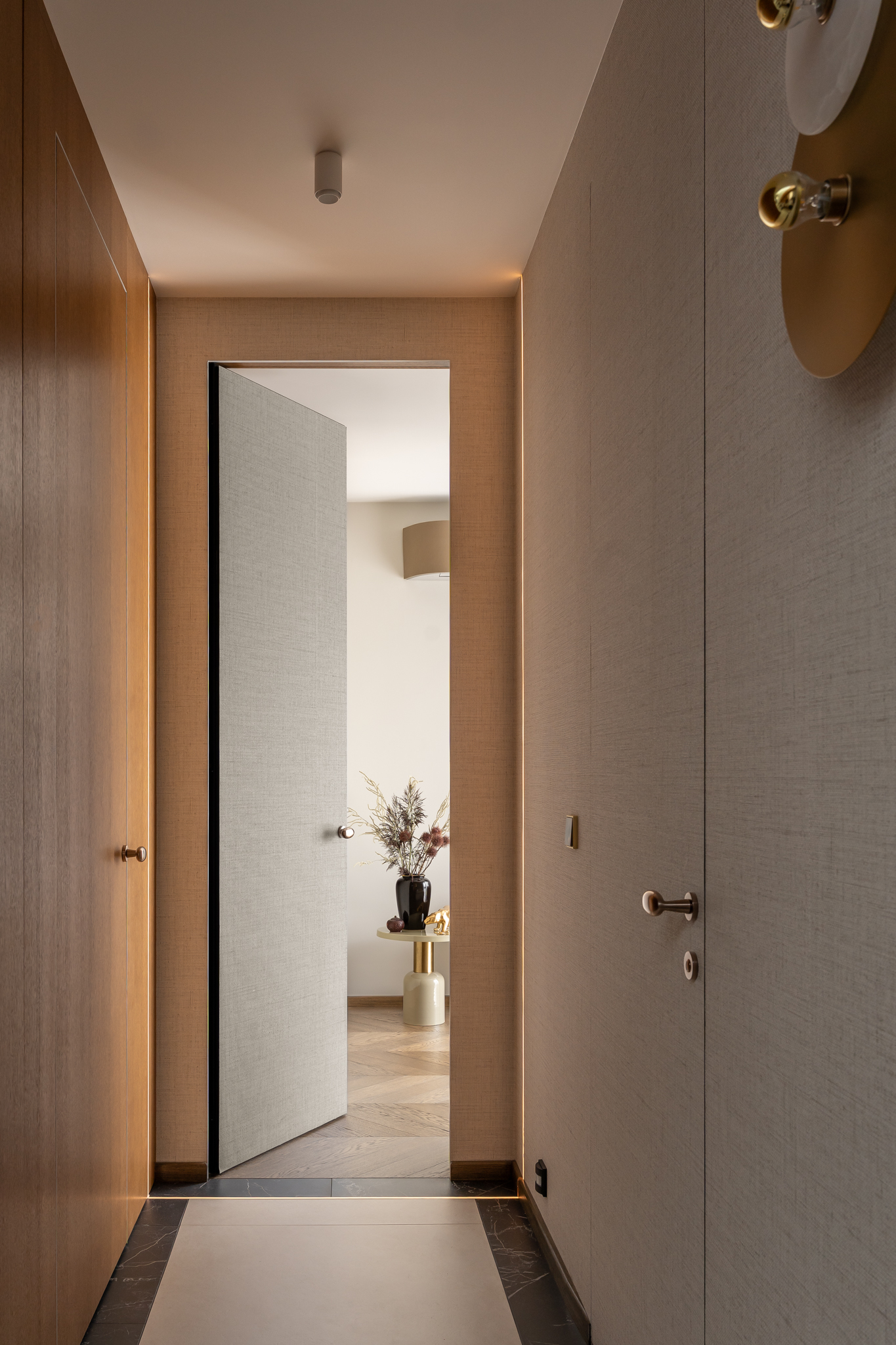 Hol – wypełniony drewnem i subtelną, teksturową tapetą – skrywa ukryte zabudowy. To przestrzeń praktyczna, lecz daleka od chłodnej funkcjonalności – światło i faktury tworzą tu atmosferę przytulnej elegancji.