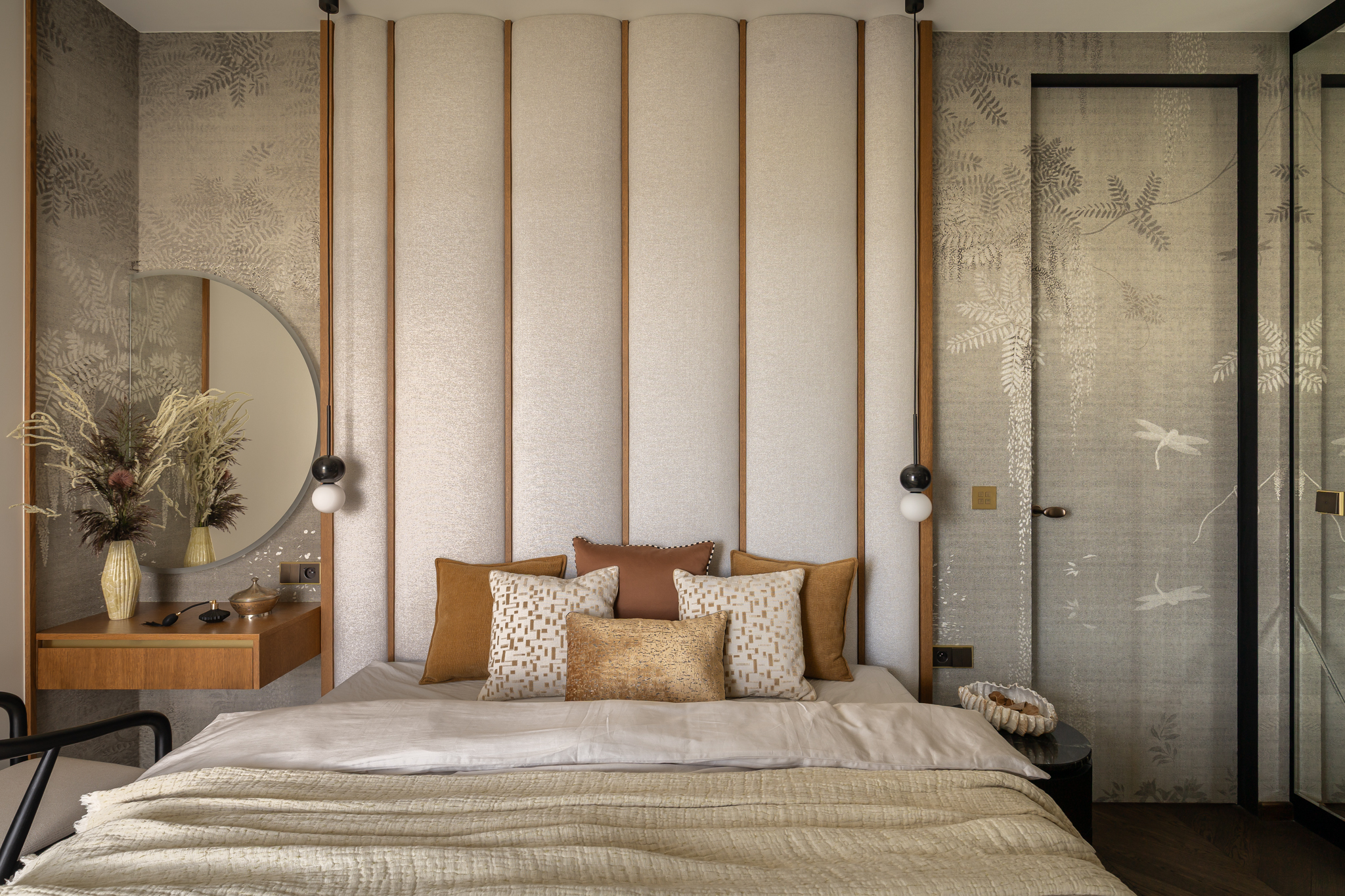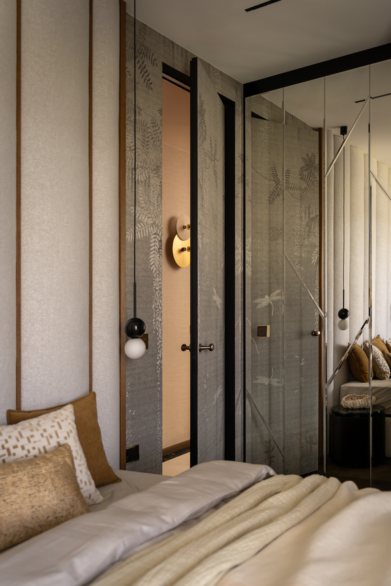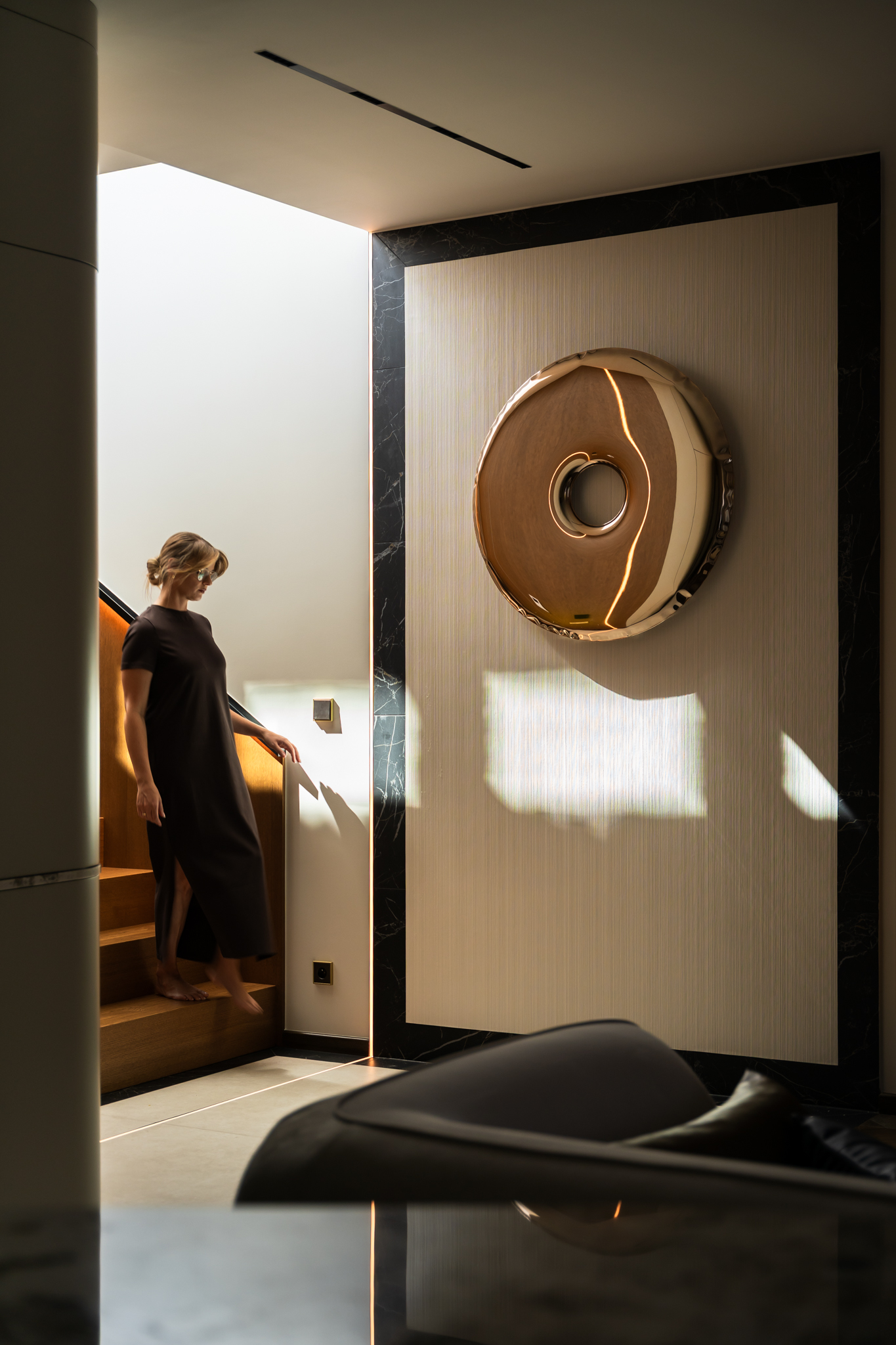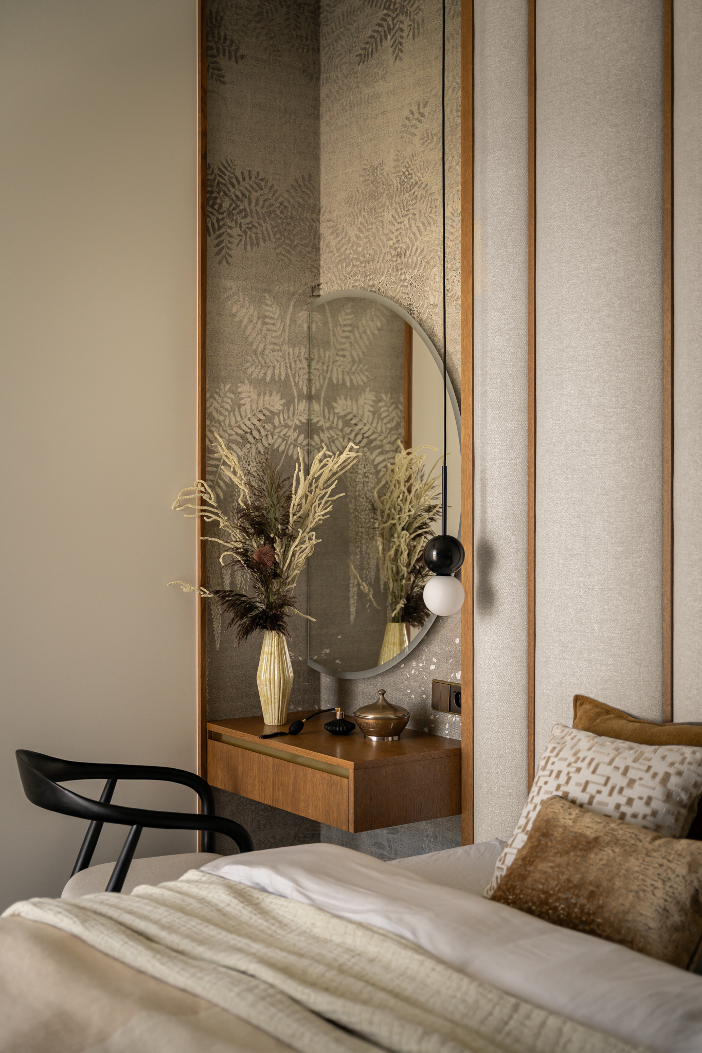 Hol – wypełniony drewnem i subtelną, teksturową tapetą – skrywa ukryte zabudowy. To przestrzeń praktyczna, lecz daleka od chłodnej funkcjonalności – światło i faktury tworzą tu atmosferę przytulnej elegancji.